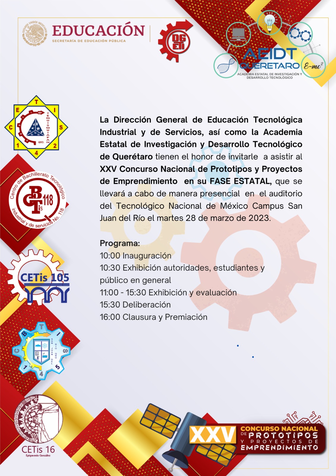 Se les informa que el día de mañana se suspenden clases normales, solamente alumnos o grupos que se les pidió apoyo para el evento de prototipos asistirán de acuerdo a las indicaciones que su profesor asignado les dé, así mismo se les invita a padres de familia, alumnos y comunidad a asistir en el siguiente programa en apoyo a nuestros competidores