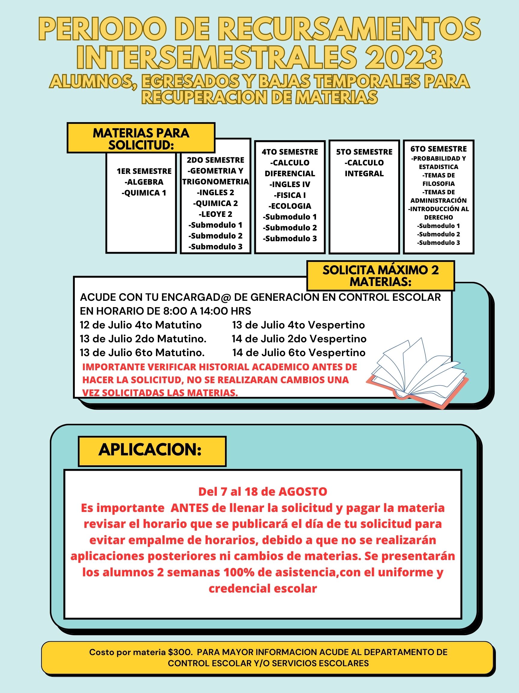Es importante ANTES de llenar la solicitud y pagar la materia revisar el horario que se publicará el día de tu solicitud para evitar empalme de horarios, debido a que no se realizarán aplicaciones posteriores ni cambios de materias. Se presentarán los alumnos 2 semanas 100% de asistencia con el uniforme y credencial escolar